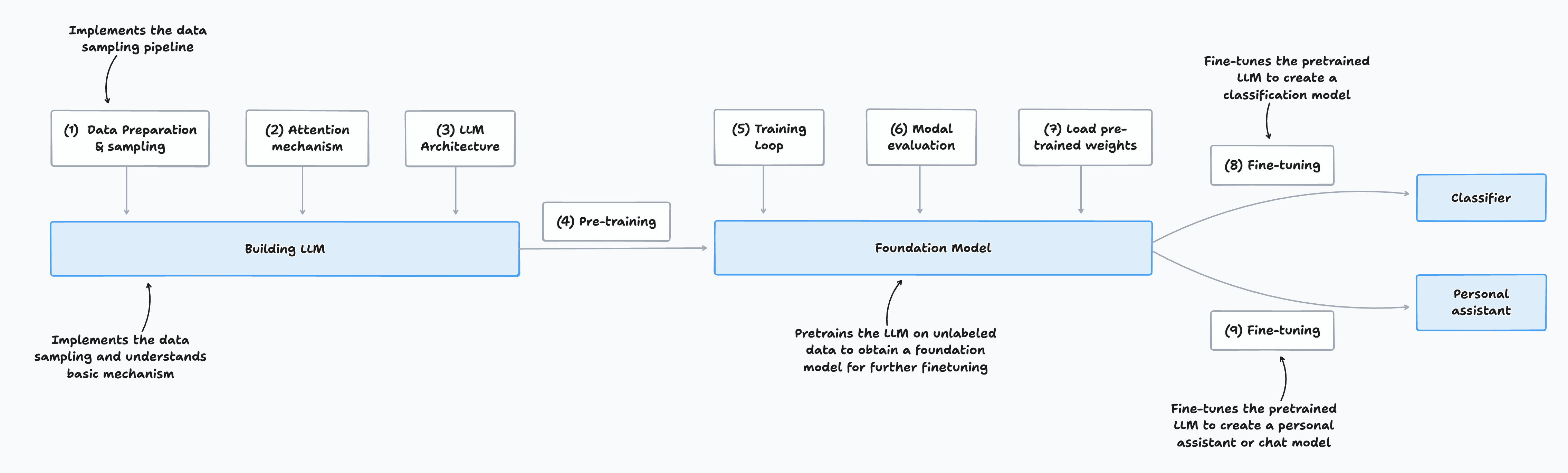 - Fine-tuning the foundation model to become a personal assistant or text classifier (stage 3)